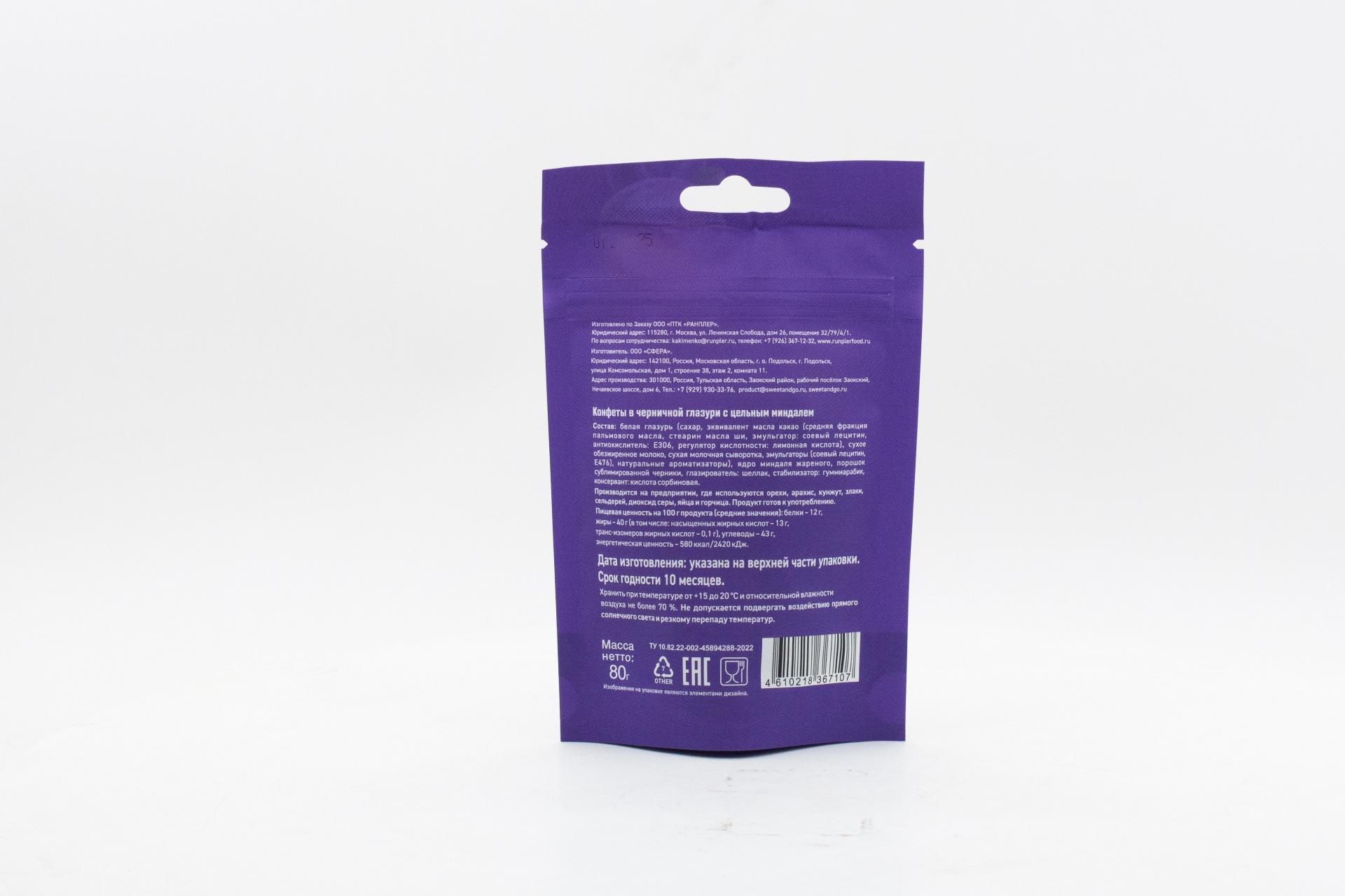 Конфеты Sweet&Go в черничной глазури с цельным миндалем (Россия) 80г0,00 руб. за штуку (в упак. 15 шт.) |